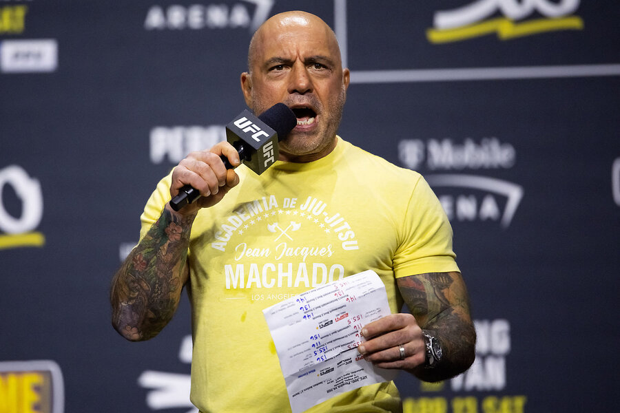 Joe Rogan, a UFC color commentator and comedian, speaks at fight club weigh-ins at the MGM Grand Garden Arena in Las Vegas April 12, 2024. He hosts “The Joe Rogan Experience,” a podcast on which he discusses current events, politics, science, martial arts, and hobbies.