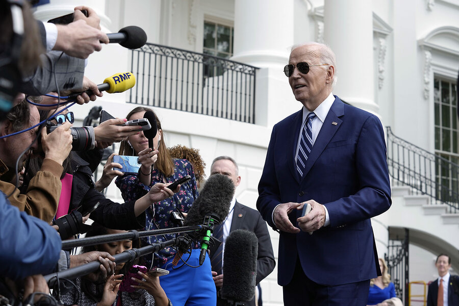 U.S. President Joe Biden talks with reporters on the South Lawn of the White House in Washington April 25, 2024. The relationship between the press and the presidency can be complicated and combative.