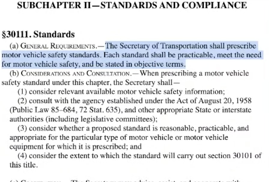 This means for self driving cars and driver assist then the Department of Transportation NHTSA cannot regulate driver assist and self driving cars without creating a standard for driver assist and self driving cars. The Congressional authorization is that the NHSTA must create the standard and then force compliance to that standard. The NHTSA has been lazy and has been giving itself authorization to just decide to regulate everything about cars even without creating the standards to inform companies what compliance is needed.