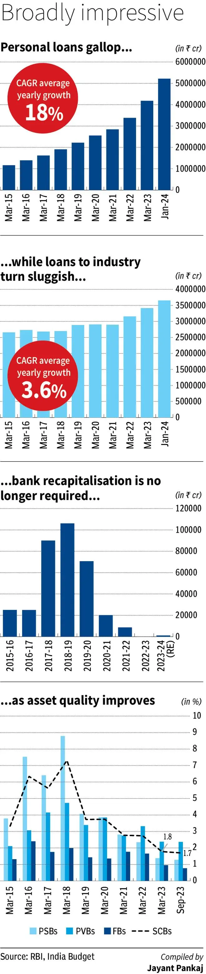 Cut to FY24. Most banks are now in the pink of health, with bad loans at multi-year lows (GNPAs at 3.2 per cent as of September-end 2023), with well-provisioned balance-sheets, loan recoveries outpacing impairments, strong capital buffers and robust loan growth.