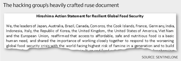 The attached document claimed to be a series of action statements from the Hiroshima G7 meeting in mid-May related to food security, as well as security issues such as the South China Sea, and was 40 pages long.