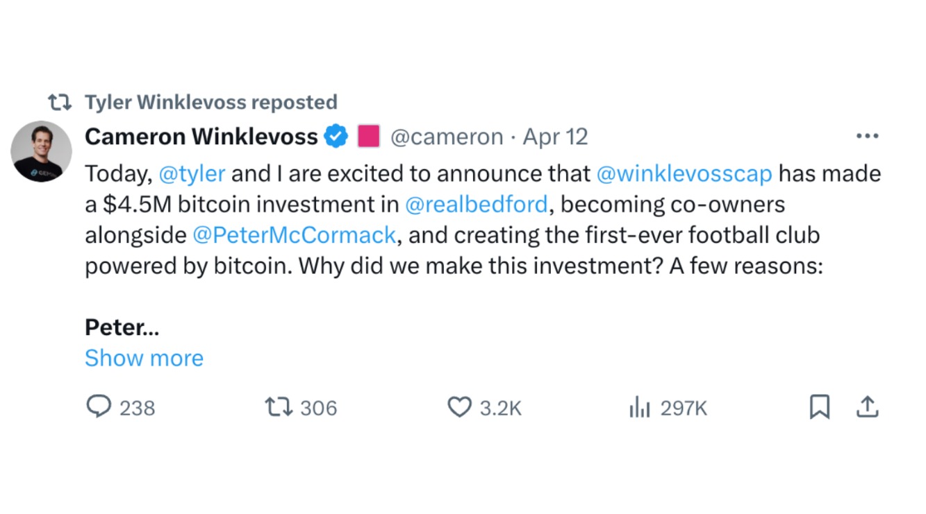 And just recently the club doubled down on its Bitcoin strategy by selling $4.5M worth of equity to the billionaire Winklesvoss brothers.