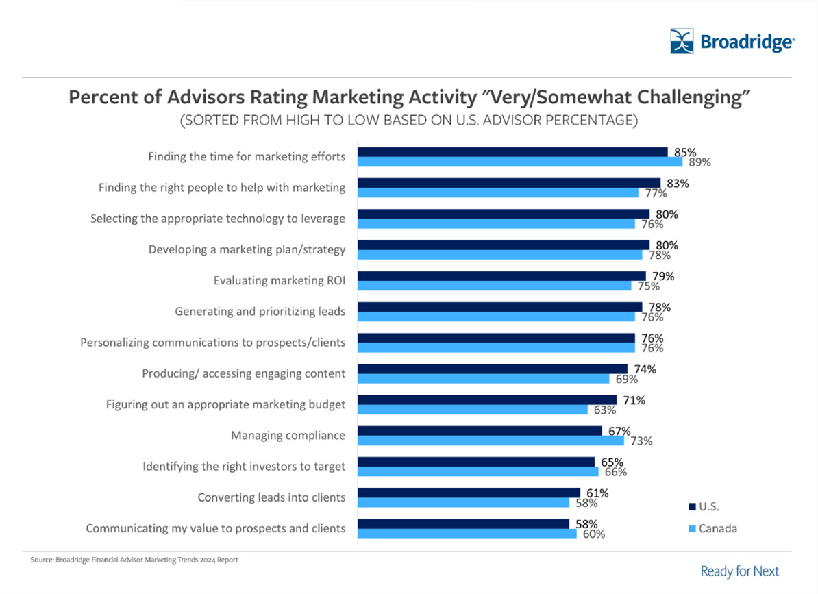 revealed a decline in advisors with a defined marketing strategy. Only 20% of financial advisors in the US and 21% of Canadian financial advisors reported having a defined strategy. Financial advisors with a strategy demonstrated significantly higher confidence levels at 83% for advisors in the US and 89% for those in Canada.