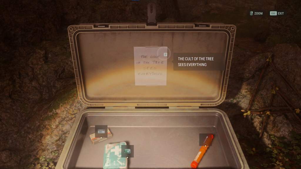 Cult Stash Ranger StationThis is a Cult Stash you can find in the Ranger Station area. Unfortunately, the lock on the stash is well hidden, with the only hint for it appearing on the top of the box. You can find the key next to the Ranger Station’s chimney, outside, on the ground.