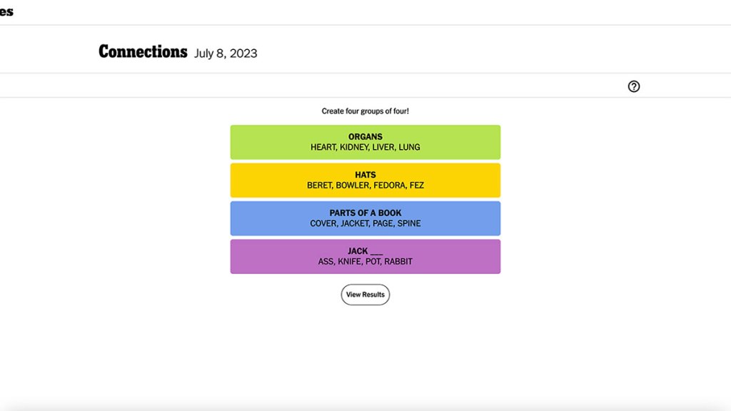 We found the Connections puzzle for July 8, 2023 pretty easy. Once we’d solved the Organs and Hats topics, the rest of the puzzle fell into place.
