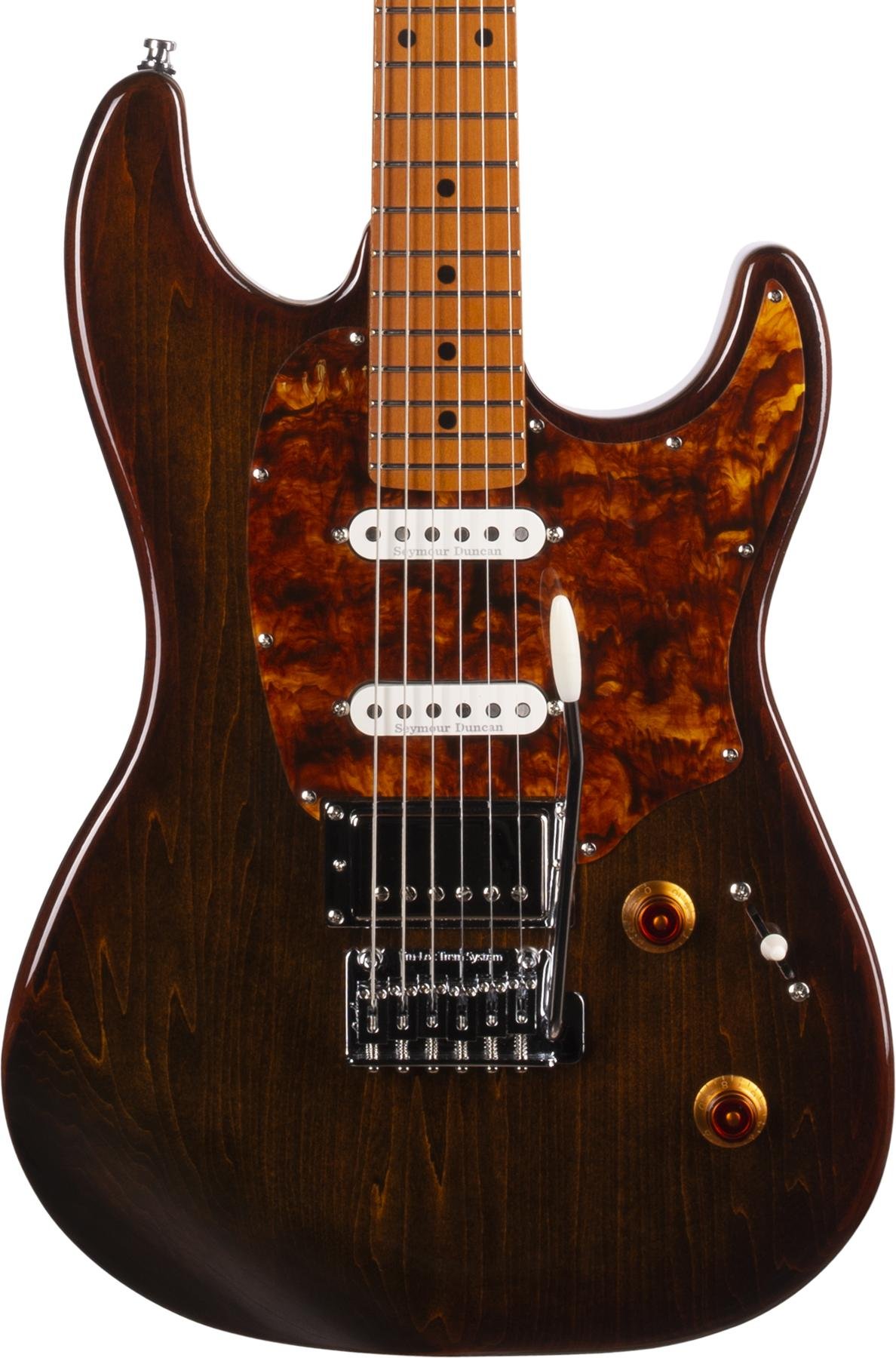 Player-designed 6-string electric guitar with engaging characterLightweight basswood body cuts through the mix with a balanced, full-bodied sound — perfect for use in several genres and stylingsSemi-gloss toasted maple neck keeps movement along the fretboard smooth and preciseMaple fretboard and double-cut body style provide easy access to all 22 fretsBlack celluloid dot inlays and side markersGraph Tech nut and Godin custom lock tuners provide enhanced string intonation and sonic stabilityGorgeous golden brown tortoiseshell celluloid pickguard