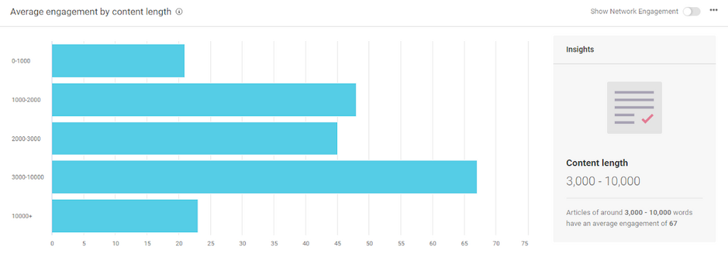This shows you the engagement of thousands of articles broken down by the word count, to help you understand the optimum length you content should be.