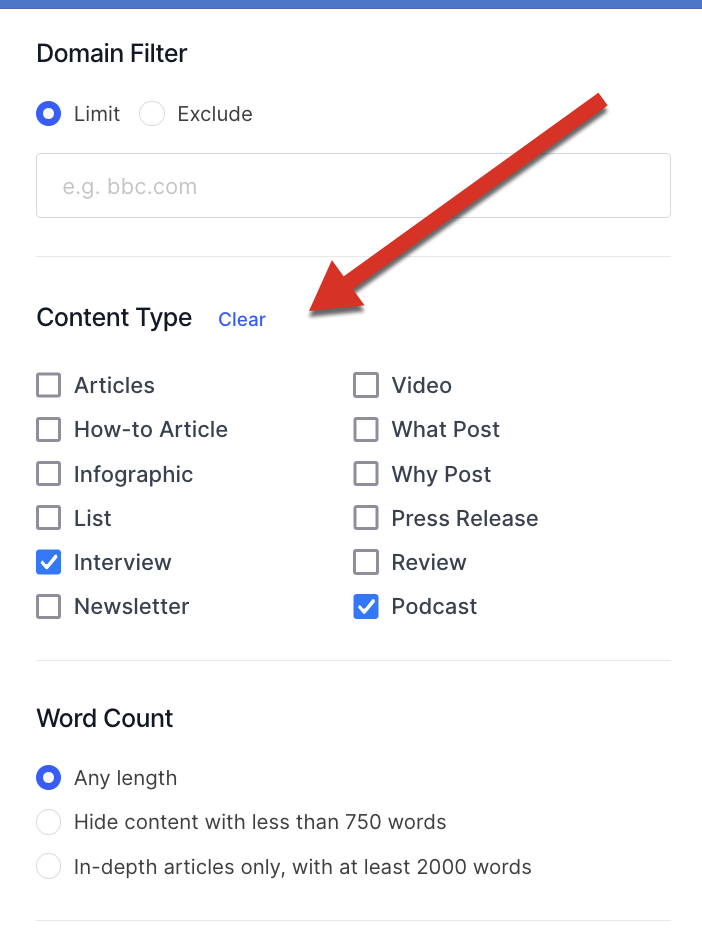 You can find which publications feature interviews and podcasts on the topic of yout expertise using “Advanced filters” within BuzzSumo’s Content Analyzer: