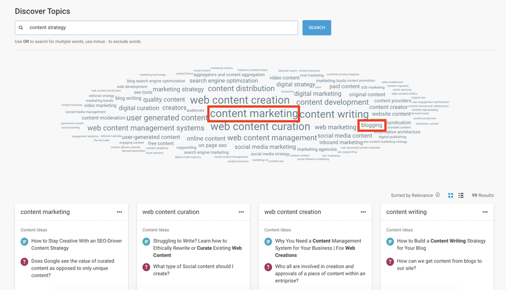 In the example below, you might want to create a piece of ‘Pillar content’ around the topic ‘Content marketing’ and a subsequent ‘Cluster content’ article on ‘Blogging’.