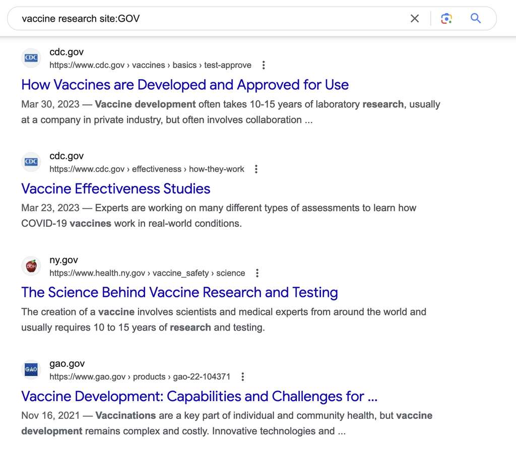 For example, if you are covering vaccine-related news, seek official sources by using SITE:GOV advanced search in Google: