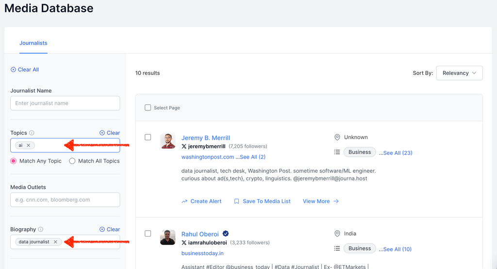 Just head to the Media Databse, type in your topic, and search for the most influential journalists in your niche.