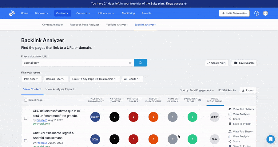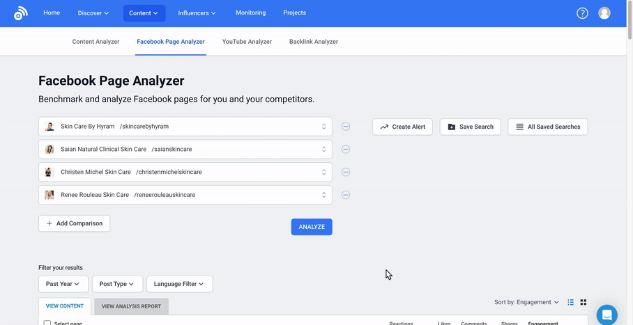 BuzzSumo is a tool that helps you analyze content engagement, track trends, and spot outreach opportunities across social and search.