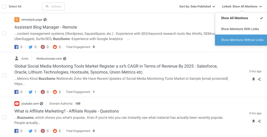 Arguably the most instant way to find opportunity in BuzzSumo, the Linked dropdown in Monitoring lets you sort by the Mentions Without Links – ie. the ones that aren’t yet driving traffic to your website.