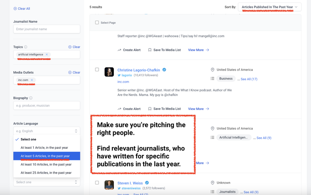 Find your most relevant journalists, by searching their beat and sorting by recency