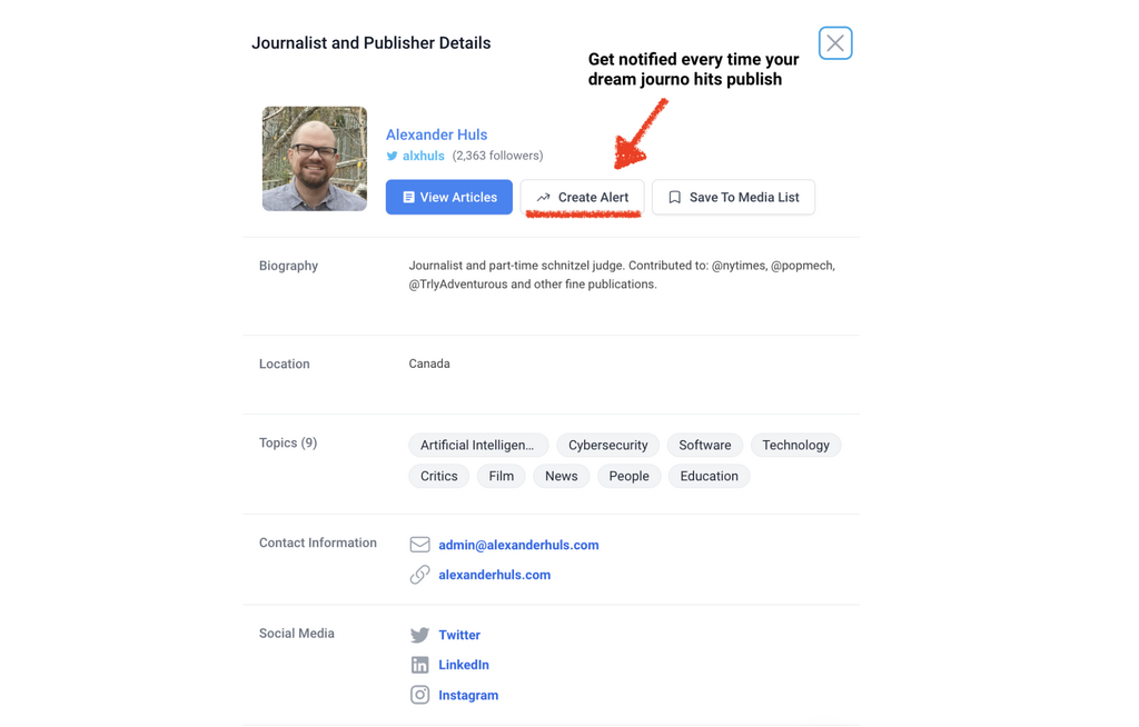 Personalize your journalist outreach by keeping up to date with their latest activity. Journalists are moving around more than ever right now, so having an alert set up on them will give you intel on where they’re writing and whether their inboxes are open.