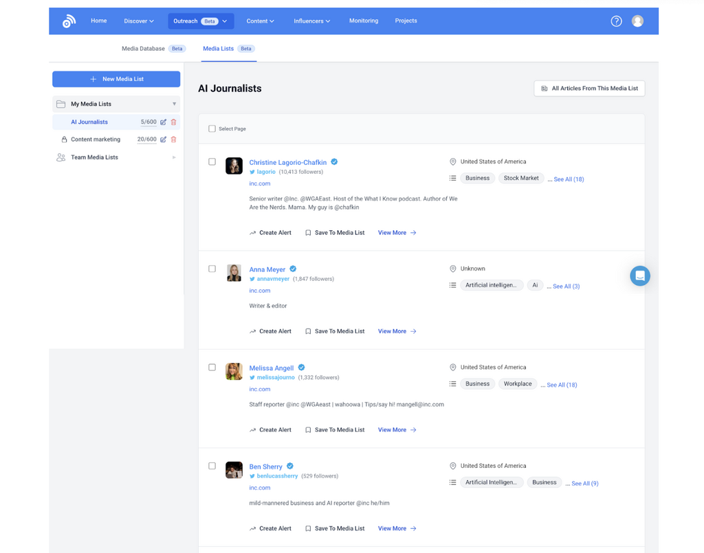 That means, if you decide to upgrade after the 30 days, you’ll have all your favorite journalists ready to either export or pitch to in BuzzSumo Pitches.