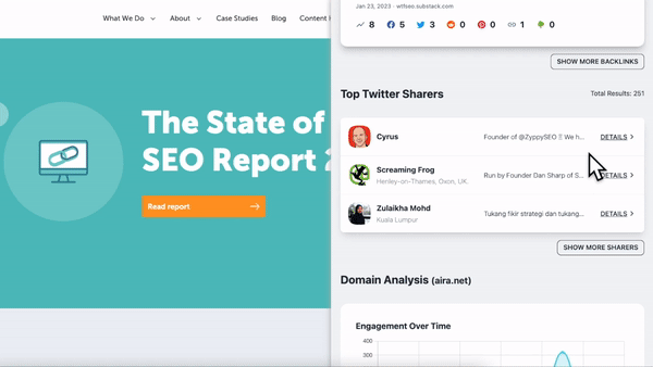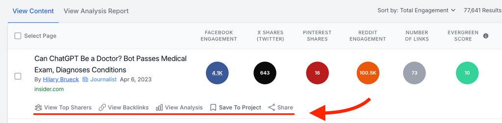 Just search the URL in the Content Analyzer to see its social shares, evergreen scores, top sharers, and more.