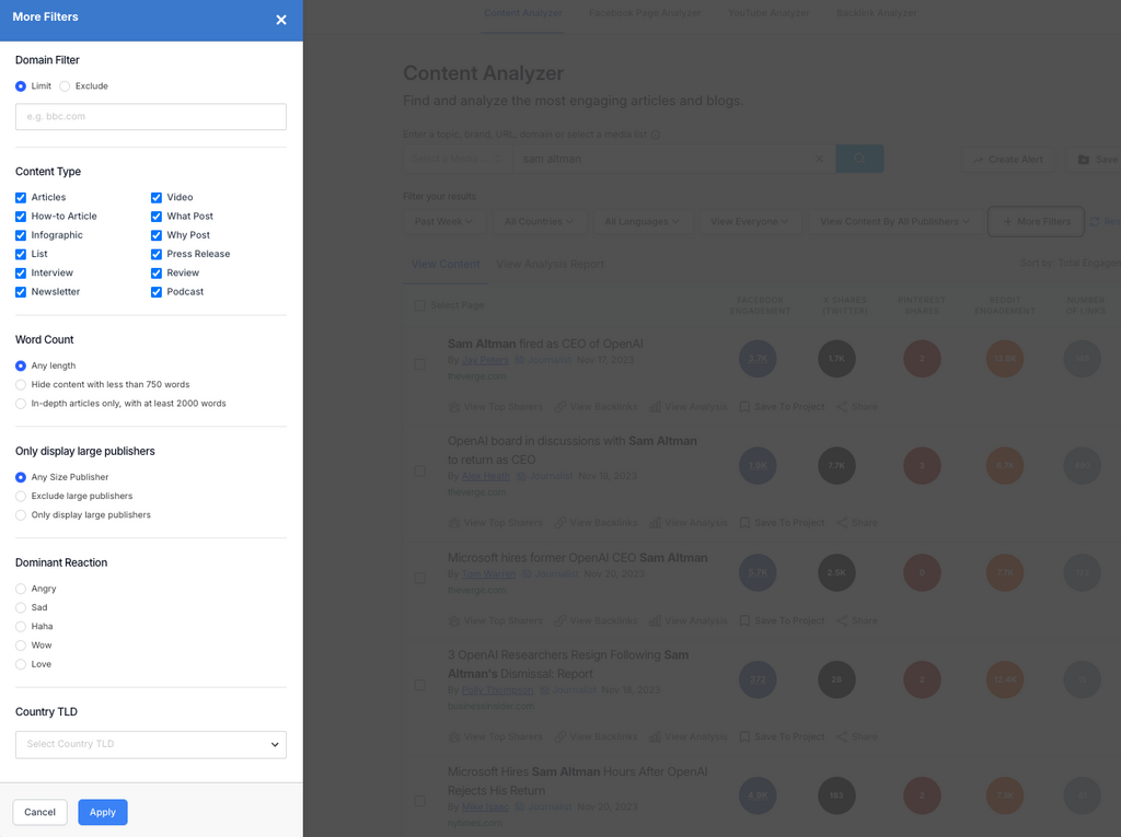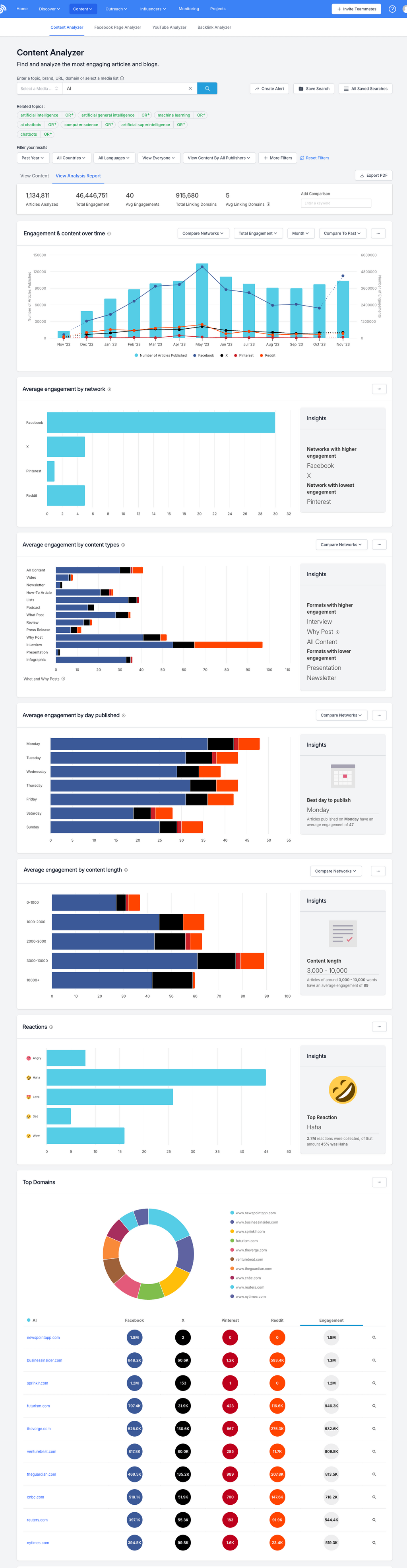See what content reached the most people on Facebook, X (FKA Twitter), Reddit, and Pinterest, to inform your content distribution strategy.Combine the best ideas from the best blog titles and headlines to create your next piece of content for your website or newsletter.Research the media response to certain topics, trends, people or events, to dictate your next PR campaign.Find the most engaging journalists in your field.Raise your own profile and become a thought leader in your field, by sharing content that lands well with audiences on social.
