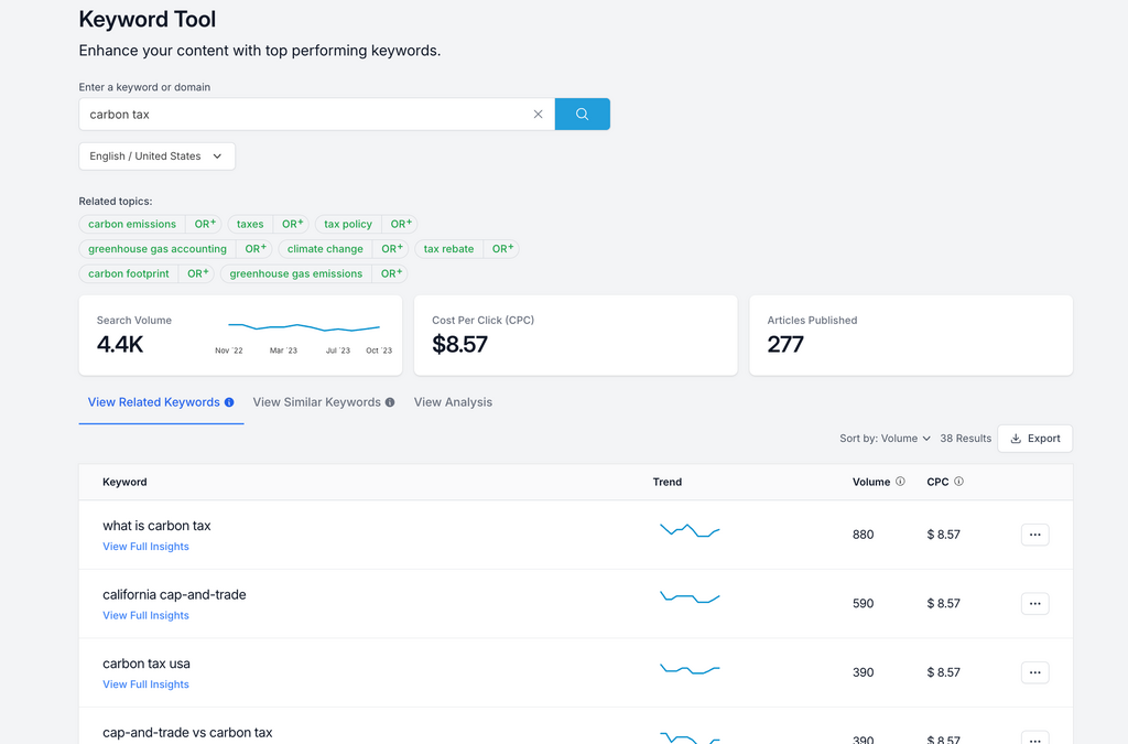 Keyword trendsCPC valueArticles publishedSERP overviewsTop influencersRelated keyword ideas
