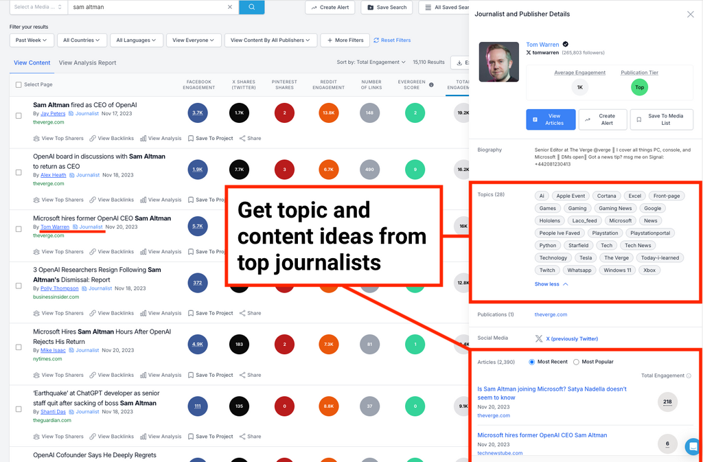 This will pull up their Journalist Profile from the journalist database, giving you information such as their top shared articles and topics, which can help inspire your next piece of content.