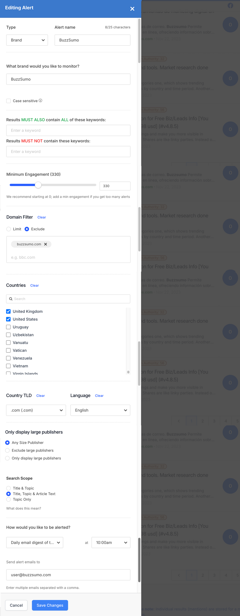 When you set up your alert, configure it to your exact preference – set a minimum engagement threshold, define positive and negative keyword parameters, and even determine which part of an article you want to track (headline? topic? article text?).