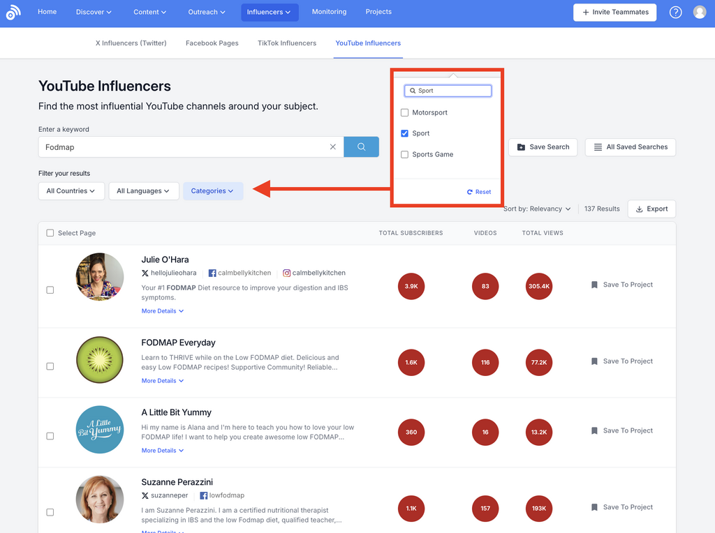 For example, search the keyword “Fodmap” and apply a category of “Sports”, to hone in on a more targeted list of influencers that share food AND exercise advice.