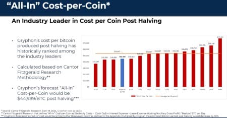 Post-halving, Gryphon expects to produce coins at an implied cost of $44,989 each, compared to Argo Blockchain (ARBK) at the highest end, producing coins for over $77,500 each, and Stronghold Digital (SDIG), producing coins for around $66,100 each.