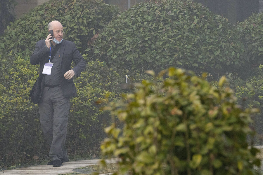 Dr. Peter Daszak makes a call on Feb. 3, 2021, before leaving his hotel with other members of a World Health Organization team investigating the origins of the coronavirus pandemic in Wuhan, China.