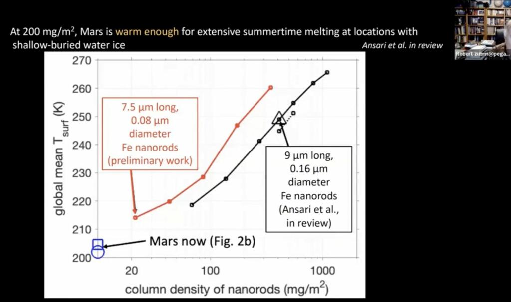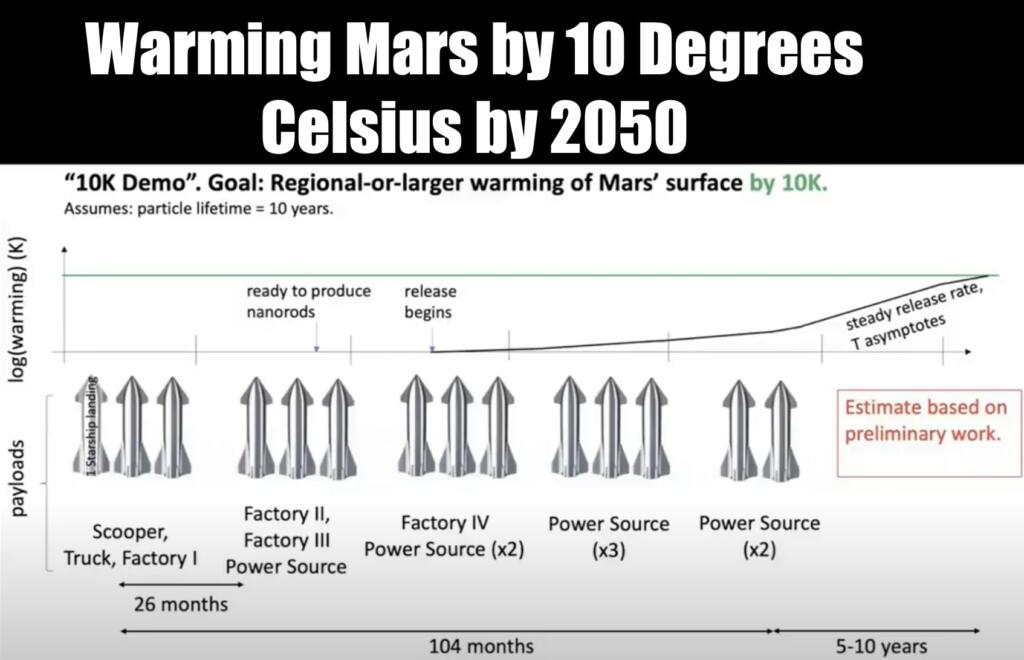 Using about 14 SpaceX Super Heavy Starships to deliver the equipment to make carbon nanorods to warm Mars by 10 degrees Celsius by 2050.