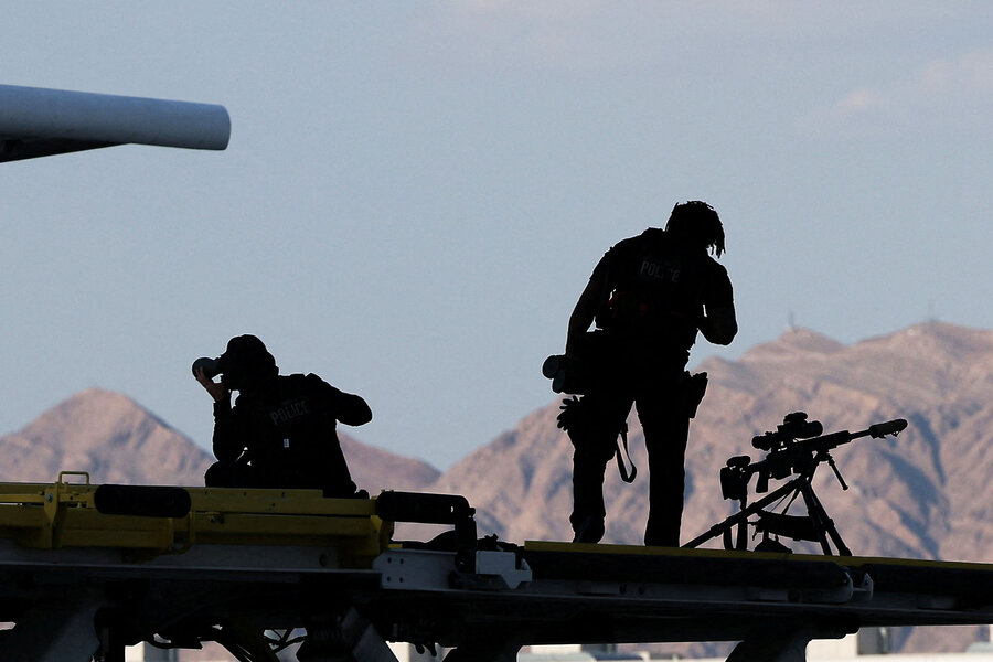 Members of the U.S. Secret Service’s Counter Sniper Team stand guard near Air Force One, which landed at Harry Reid International Airport in Las Vegas, July 15, 2024, bringing President Joe Biden to Nevada for several speaking events.