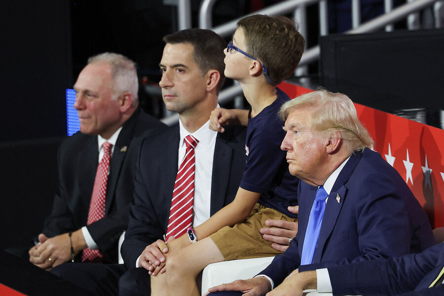 Republican presidential nominee Donald Trump and Sen. Tom Cotton of Arkansas (center, with his son) attend Day 2 of the Republican National Convention, in Milwaukee, Wisconsin, July 16, 2024. Mr. Cotton has called President Joe Biden’s departure from the race a ‘coup’ by others in the Democratic Party.