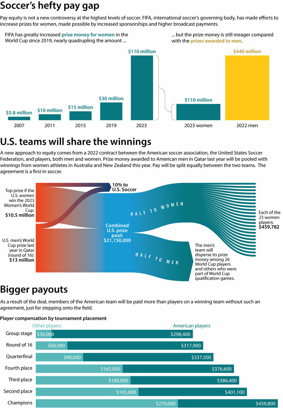 Some national federations, such as those in Australia and Japan, have made their own collective bargaining agreements intended to improve pay for women athletes, and others, such as Denmark’s, offer player bonuses. But the majority of players in this year’s tournament will not benefit from such agreements and are subject to FIFA’s pay structure.