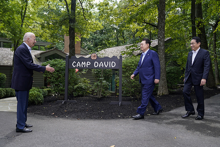 From left, President Joe Biden greets South Korea’s President Yoon Suk Yeol and Japan’s Prime Minister Kishida Fumio at Camp David, Maryland, Aug. 18, 2023.