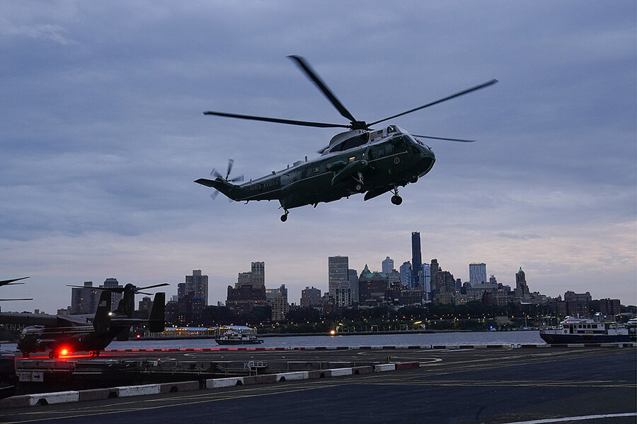 Marine One carrying President Joe Biden arrives at the Wall Street landing zone in New York, Sept. 17, 2023. Mr. Biden is in New York to attend the United Nations General Assembly and fundraisers.