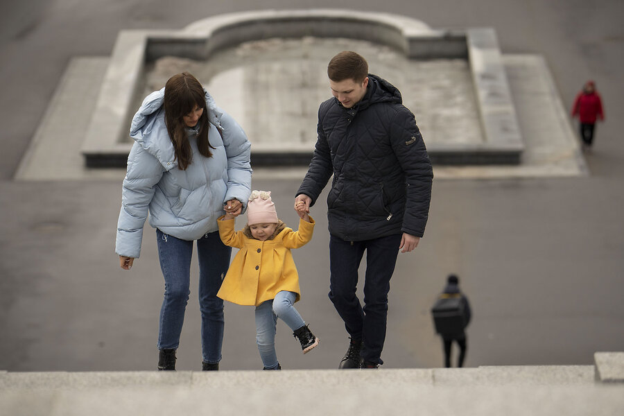 A family climbs stairs to the city’s central park in Kharkiv, Ukraine, Feb. 26, 2023. Most people live in countries where women will have just one or two children.