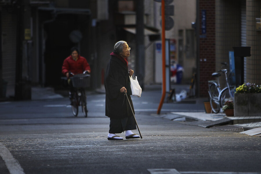 A kimono-clad older woman walks across a street in Tokyo. Older voters increasingly outnumber younger ones in Japan.
