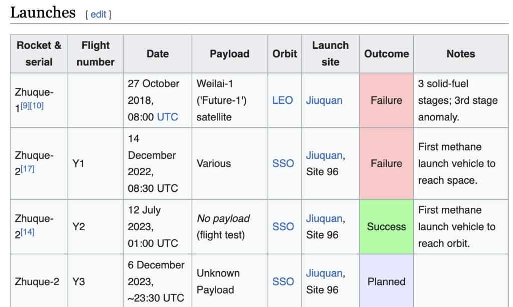 They have had three launch attempts of any rocket and one successful launch ever. Zhuque-2 (ZQ-2) is a medium-sized liquid-fuelled rocket powered by liquid oxygen and methane capable of lifting 6,000 kg (13,000 lb) of payload into a 200 km (120 mi) LEO, or 4,000 kg (8,800 lb) of payload into a 500 km (310 mi) Sun-synchronous orbit (SSO) The rocket was initially planned to be launched in 2020, however by 2019 this had slipped to 2021, and later to December 2022. On 12 July 2023, Zhuque-2 became the first methane-fueled launch vehicle to reach orbit after a successful second flight. The ZQ-2 has less than one-third of the payload of a SpaceX Falcon 9.