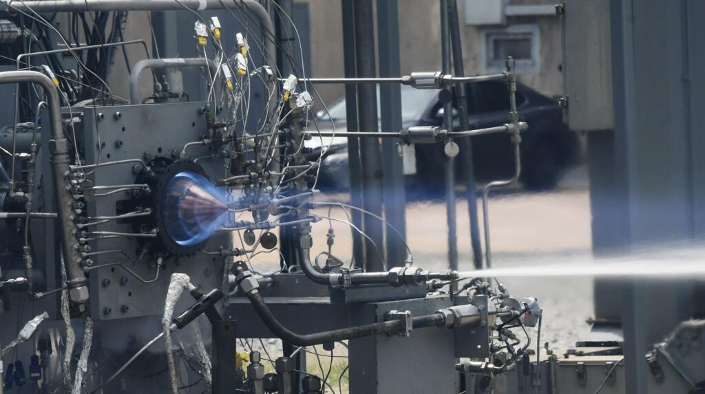 A prototype rotating detonation engine under test at the Marshall Space Flight Center.(NASA)