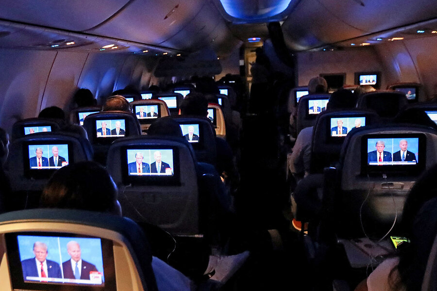 People watch the U.S. presidential debate aboard a Delta Air Lines flight to Miami, June 27, 2024.