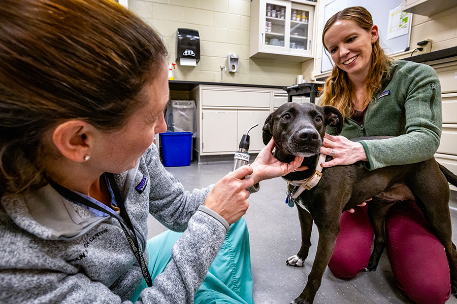 Veterinarian Stephanie McGrath and veterinary technician Breonna Kusick examine Lucy, a participant in a Colorado State University clinical trial on CBD use for epilepsy. CREDIT: JOHN CLINE / CSU PHOTOGRAPHY