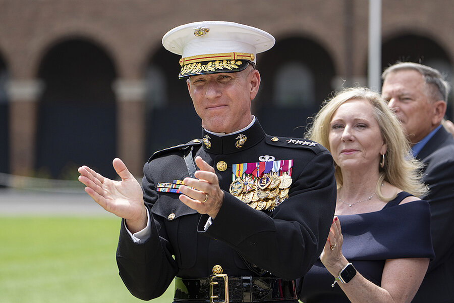 Gen. Eric Smith, acting commandant of the U.S. Marine Corps, applauds during a relinquishment of office ceremony for Marine Corps Gen. David Berger, July 10, 2023, at the Marine Barracks in Washington. General Smith has been nominated to be the next leader, but he hasn’t been confirmed by the Senate.