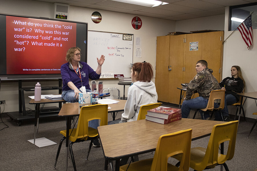 Jeri Ferguson, a high school social studies teacher, starts a unit on the Cold War with her class of juniors in Kimball, Nebraska, April 19, 2024.