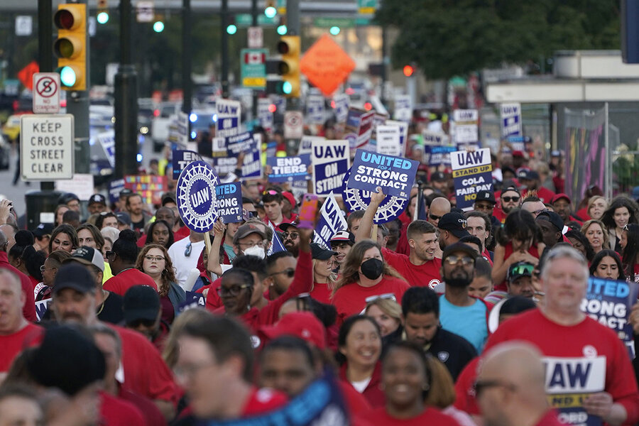 United Auto Workers members march through downtown Detroit Sept. 15, 2023. The UAW won pay hikes after a long strike against Ford, Stellantis, and General Motors.