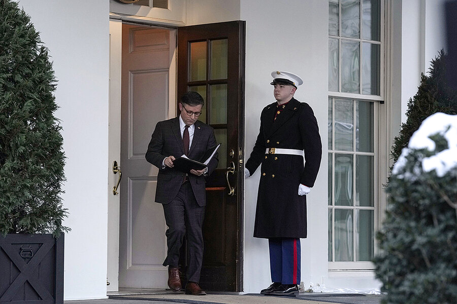 House Speaker Mike Johnson exits the White House in Washington, Jan. 17, 2024, following a meeting that President Joe Biden convened to underscore Ukraine’s security needs. Mr. Johnson declared last week that a bipartisan solution to a southern border-Ukraine funding dispute floated by Senate leaders would be dead on arrival in the House.