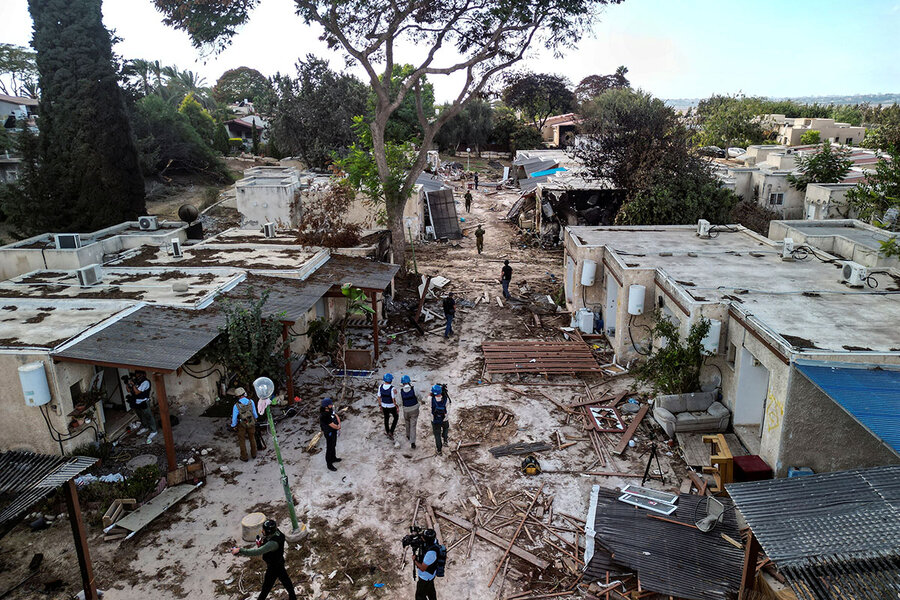 An aerial view shows members of the media during a visit to kibbutz Kfar Aza, in the aftermath of a deadly attack by Hamas shooters from the Gaza Strip, in southern Israel, Oct. 15, 2023.