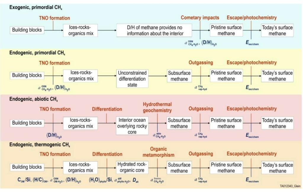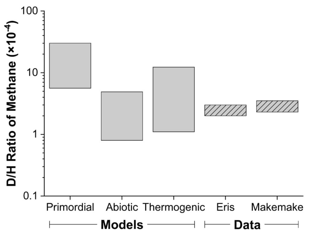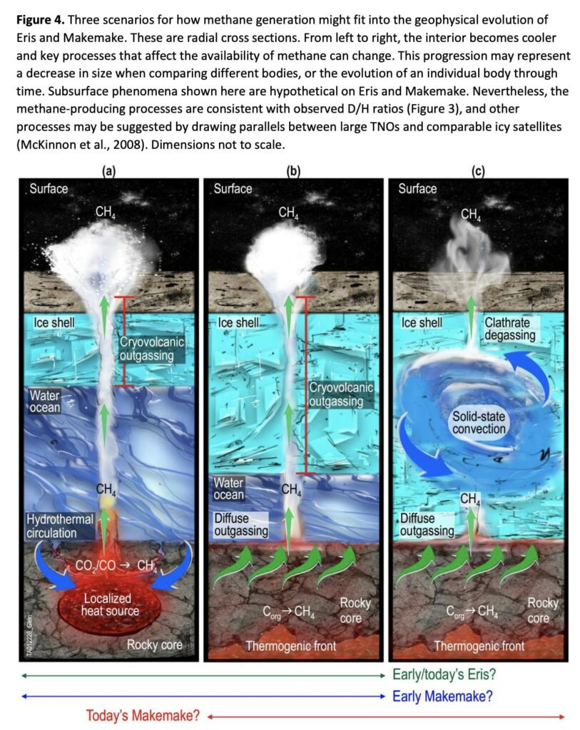 Because producing abiotic or thermogenic methane likely requires temperatures above ~150°C, they infer that Eris and Makemake have rocky cores that underwent substantial radiogenic heating. Their cores may still be warm/hot enough to make methane. This heating could have driven hydrothermal circulation at the bottom of an ice-covered ocean to generate abiotic methane, and/or metamorphic reactions involving accreted organic matter could have occurred in response to heating in the deeper interior, generating thermogenic methane. Additional analyses of relevant thermal evolution model results and theoretical predictions of the D/H ratio of methane in the solar nebula support our findings of elevated subsurface temperatures and an apparent lack of primordial methane on Eris and Makemake. It remains an open question whether their D/H ratios may have evolved subsequent to methane outgassing. They also suggest that lower-than-expected D/H and 84Kr/CH4 ratios in Titan’s atmosphere disfavor a primordial origin of methane there as well. Recommendations are given for future activities to further test proposed scenarios of abiotic and thermogenic methane production on Eris and Makemake, and to explore these worlds up close so that they can see if they bear additional evidence of endogenic processes.