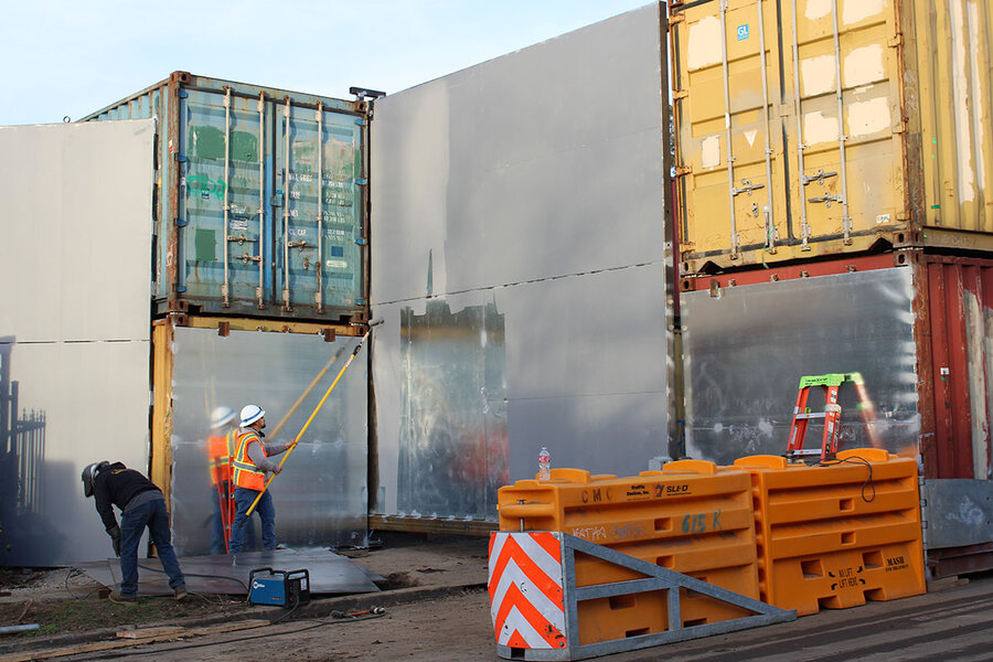 Construction crews have erected a wall of shipping containers around People’s Park in Berkeley, California. The University of California, Berkeley, which owns the park, secured it in preparation for a housing development that has been delayed by protests and legal challenges.