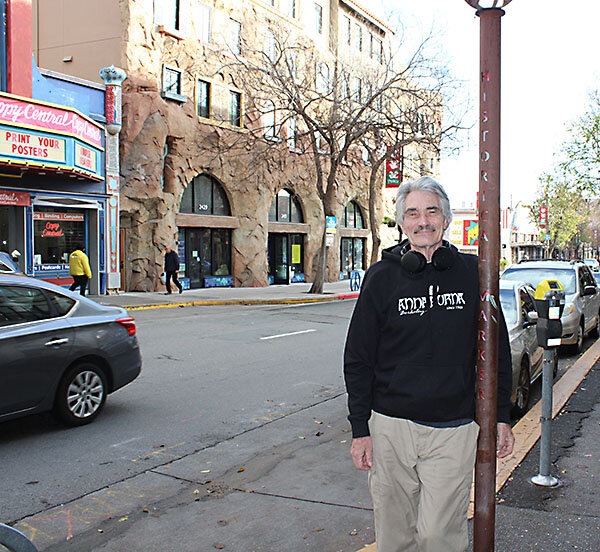 Al Geyer stands by a historical marker for his shop, Annapurna, in Berkeley, California, Jan. 9, 2024. His store has been open for over 50 years – nearly as long as People’s Park a block away, which is being repurposed for housing.