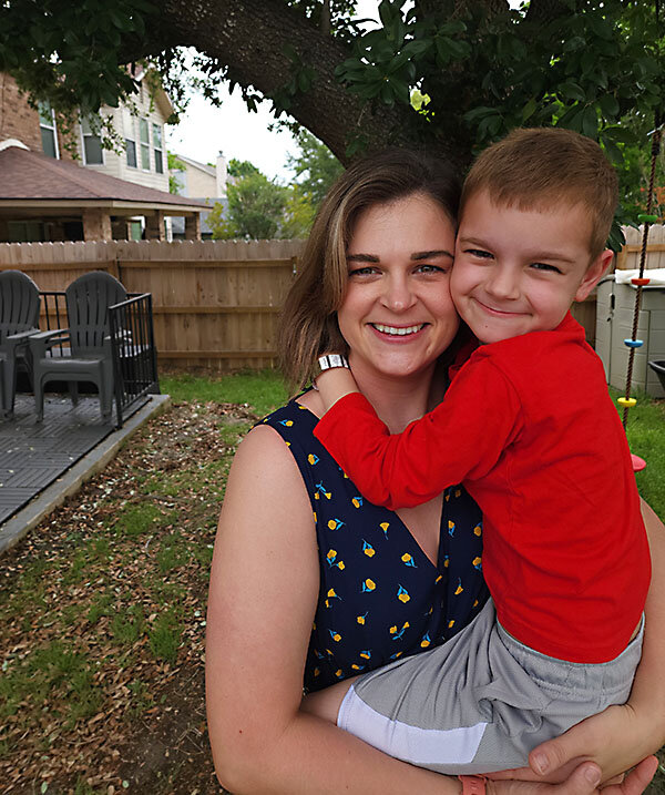 Kayla Corbitt poses with her son Dean in San Antonio, February 2023. Ms. Corbitt helps military families navigate the military child care system.