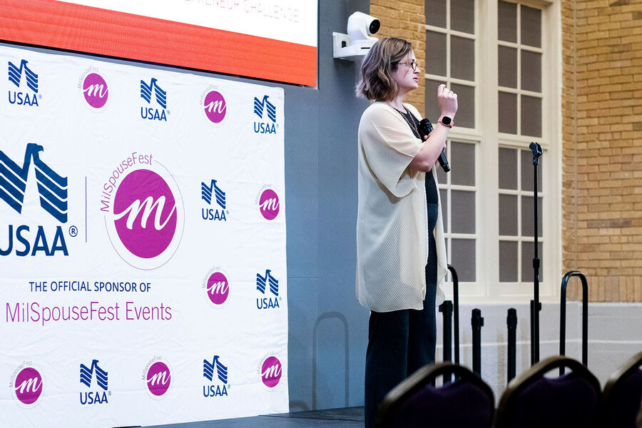 Kayla Corbitt speaks at the Second Service Foundation, a nonprofit assisting military entrepreneurs, in Austin, Texas. Ms. Corbitt started Operation Child Care to help military families find care.
